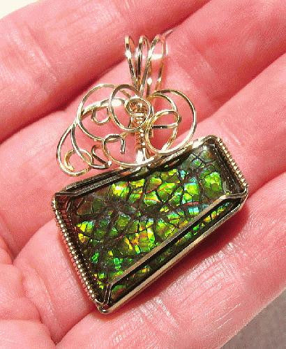 This ammolite pendant is handcrafted from 14K/20 gold filled wire and a natural ammolite freeform cabochon (cab). It will change as you move,flashing out it’s full colors as the viewer catches it from the right angle. It can go from dark to brilliant, with wonderful plays of colors. The colors arehard to describe, as they change as the stone moves.There are oranges, yellows, greens, and teals, as well as red lines between scales.