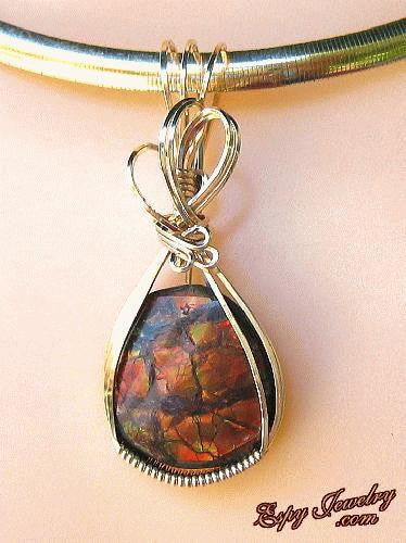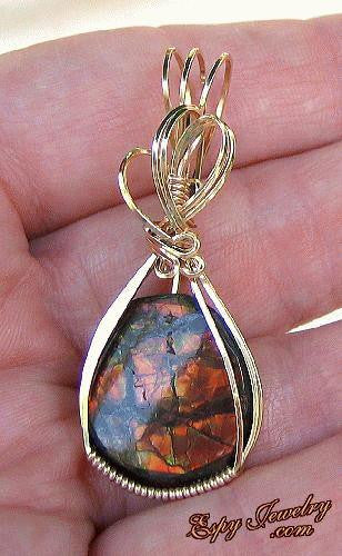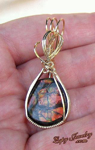 This ammolite pendant is handcrafted from 14K/20 gold filled wire and a natural ammolite freeform cabochon (cab). It will change as you move, flashing out it’s full colors as the viewer catches it from the right angle. It can go from dark to very bright. It is an unusual color - the only one I have seen like this - and I can only really describe it as a stormy orange.