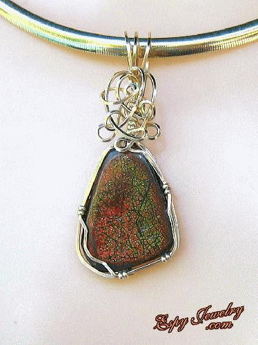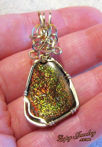 This ammolite pendant is handcrafted from 14K/20 gold filled wire and a natural ammolite freeform cabochon (cab). It will change as you move, flashing out it’s full colors as the viewer catches it from the right angle. It can go from dark to brilliant. The pattern is a dragon skin with extremely small scales that make the stone look like it is packed with glitter. It is definitely in