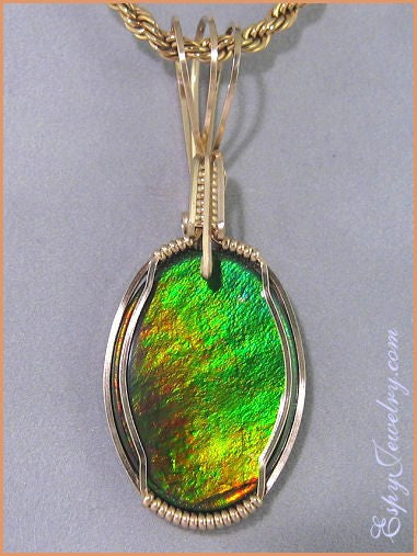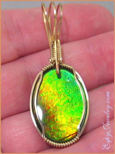 This ammolite pendant is handcrafted from 14K/20 gold filled wire and an ammolite triplet. It has a lovely mix of green, yellow, and orange. I don’t think the orange and yellow are as distinct as in the pictures though. To me it is more of a blush of varying shades of oranges on the left and bottom of the stone.