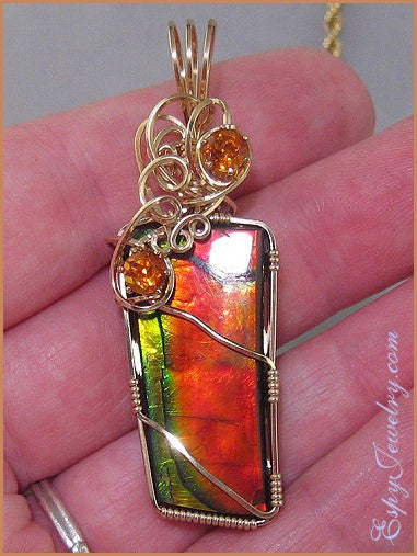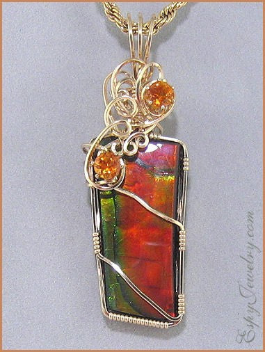 This ammolite pendant is handcrafted from 14K/20 gold filled wire and a natural ammolite freeform cabochon (cab). It is predominately red with with an emerald green border on the left side. It is accented with two citrines.