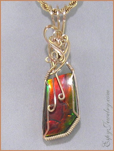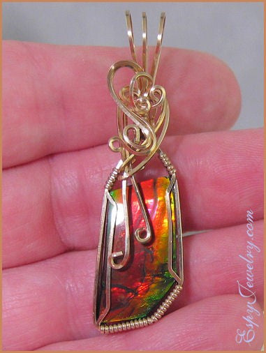 This ammolite pendant is handcrafted from 14K/20 gold filled wire and a natural ammolite freeform cabochon (cab). It is predominately red with green edges.