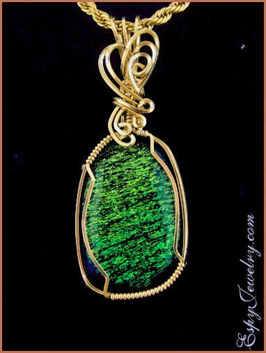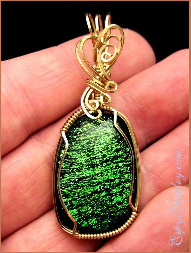This glass pendant is handcrafted from 14K/20 gold filled wire and a green dichroic glass cabochon.