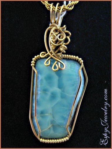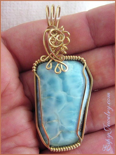 This larimar pendant is handcrafted from 14K/20 gold filled wire and a larimar cabochon (cab) from the Dominican Republic. It is a big, thick piece of larimar with a gorgeous color. The robin’s egg blue is accented with billowy white. I think the white is more pronounced in person than in this picture.