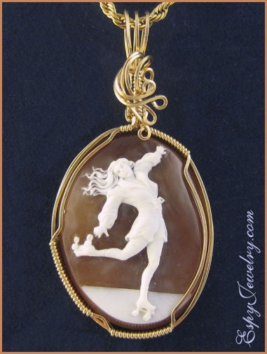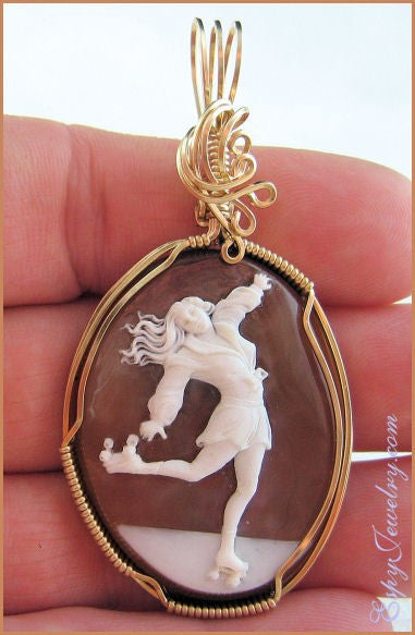 This shell cameo pendant is handcrafted from 14K/20 gold filled wire and a cameo carved in shell of a lively and fun roller skater. A more modern take on a cameo!