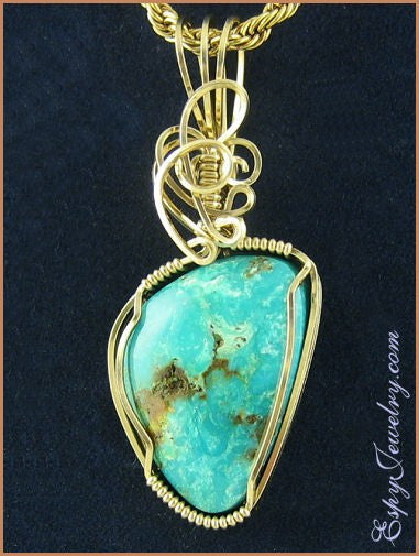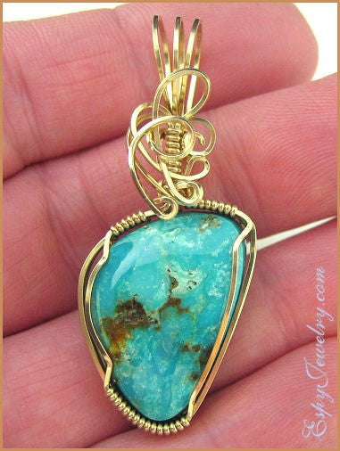 This turquoise pendant is handcrafted from 14K/20 gold filled wire and a stabilized turquoise cabochon (cab) from Kingman, AZ. It has a lovely blue color and a nice matrix pattern.