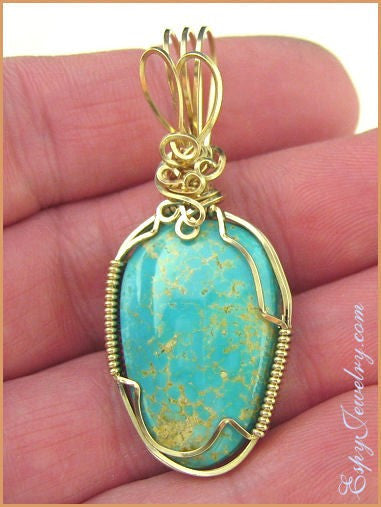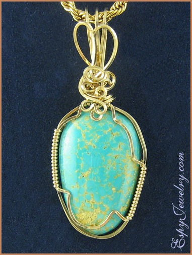 This little turquoise pendant is handcrafted from 14K/20 gold filled wire and a stabilized turquoise cabochon (cab) from the #8 Mine, NV. It has a lovely turquoise color and tan matrix.