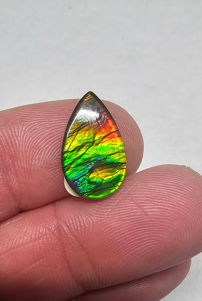 Ammolite is the fossilized shell of an ancient sea creature and is a rare, organic gemstone. This ammolite stone will change as you move, flashing out it’s full colors as the viewer catches it from the right angle and going dark or brownish when the light is coming from the wrong direction.