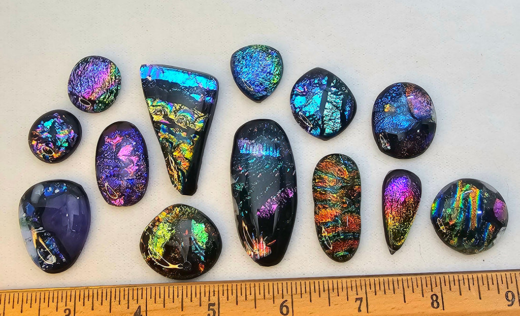 Set of 13 assorted dichroic glass cabochons for creating jewelry. Be artistic and create your own unique setting or simply glue on a finding like a pendant bail.