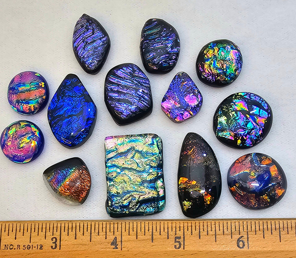 Set of 13 assorted dichroic glass cabochons for creating jewelry. Be artistic and create your own unique setting or simply glue on a finding like a pendant bail.