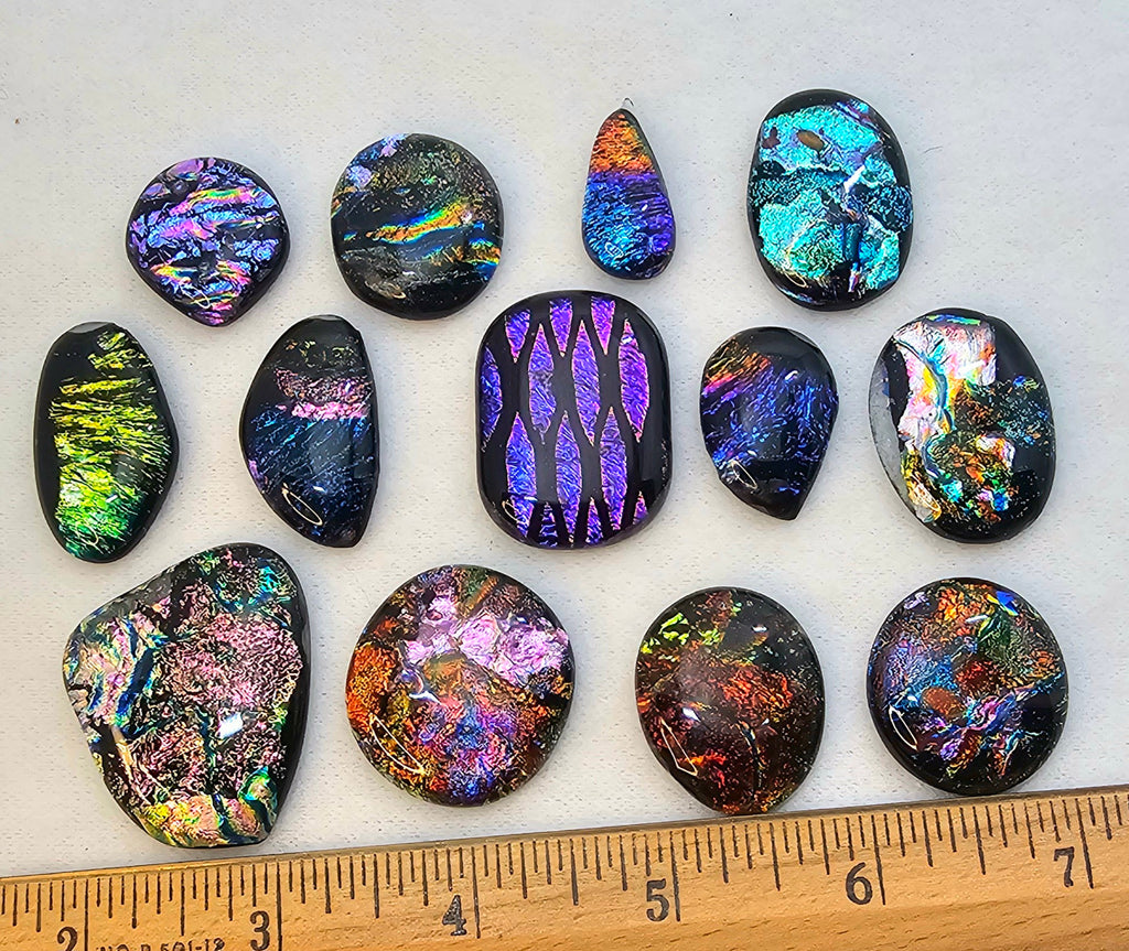 Set of 13 assorted dichroic glass cabochons for creating jewelry. Be artistic and create your own unique setting or simply glue on a finding like a pendant bail.