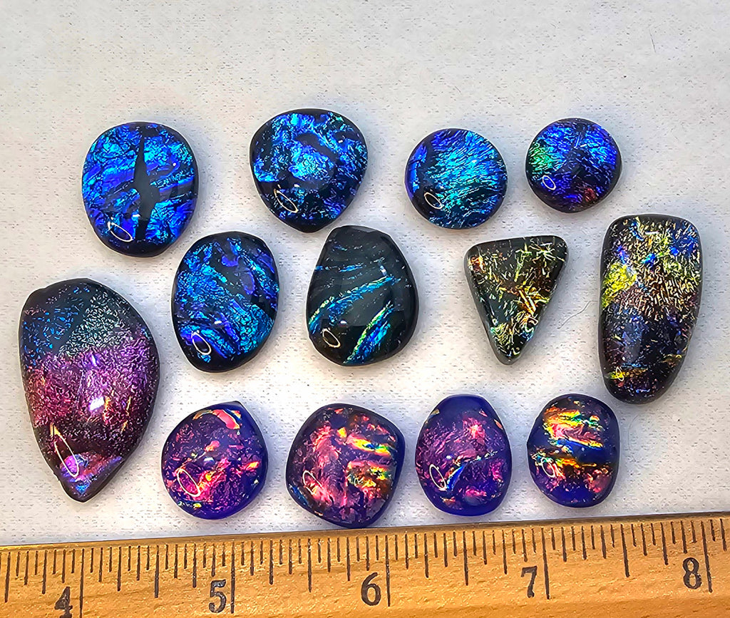 Set of 13 assorted dichroic glass cabochons for creating jewelry. Be artistic and create your own unique setting or simply glue on a finding like a pendant bail.