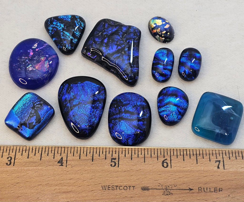 Set of 11 assorted dichroic glass cabochons for creating jewelry. Be artistic and create your own unique setting or simply glue on a finding like a pendant bail.