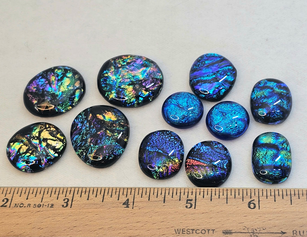 Set of 11 assorted dichroic glass cabochons for creating jewelry. Be artistic and create your own unique setting or simply glue on a finding like a pendant bail.
