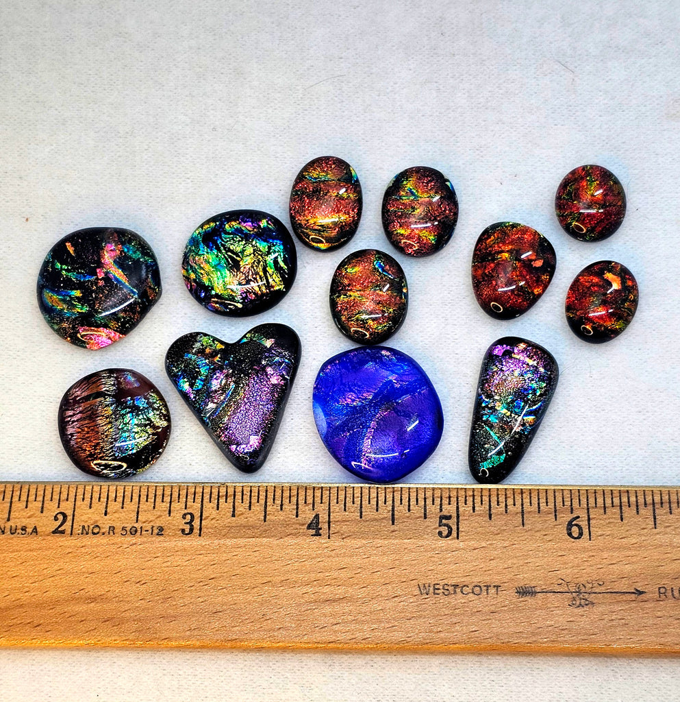 Set of 12 assorted dichroic glass cabochons for creating jewelry. Be artistic and create your own unique setting or simply glue on a finding like a pendant bail.