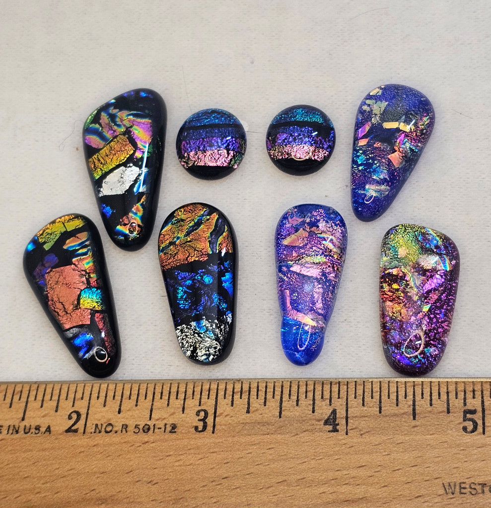 Set of 8 assorted dichroic glass cabochons for creating jewelry. Be artistic and create your own unique setting or simply glue on a finding like a pendant bail.