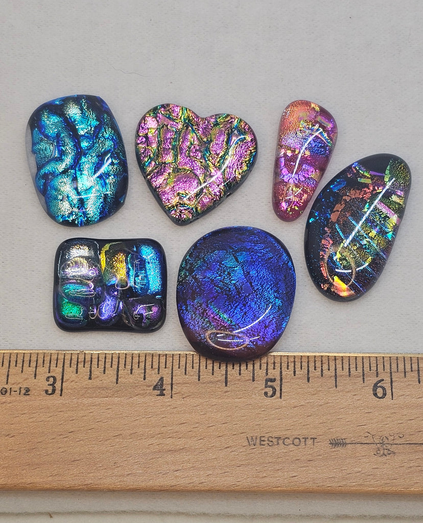 Set of 6 assorted dichroic glass cabochons for creating jewelry. Be artistic and create your own unique setting or simply glue on a finding like a pendant bail.