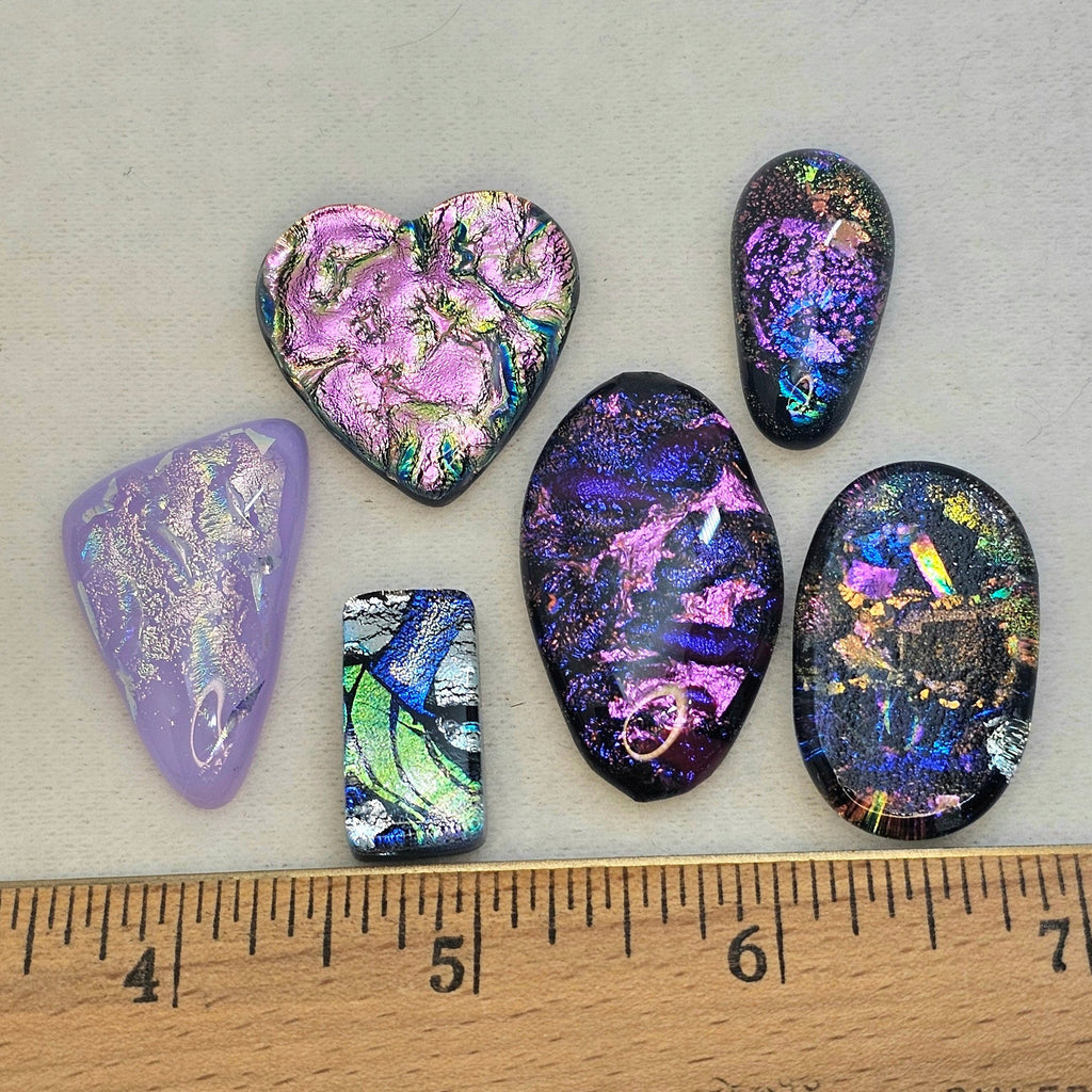 Set of 6 assorted dichroic glass cabochons for creating jewelry.  Be artistic and create your own unique setting or simply glue on a finding like a pendant bail.